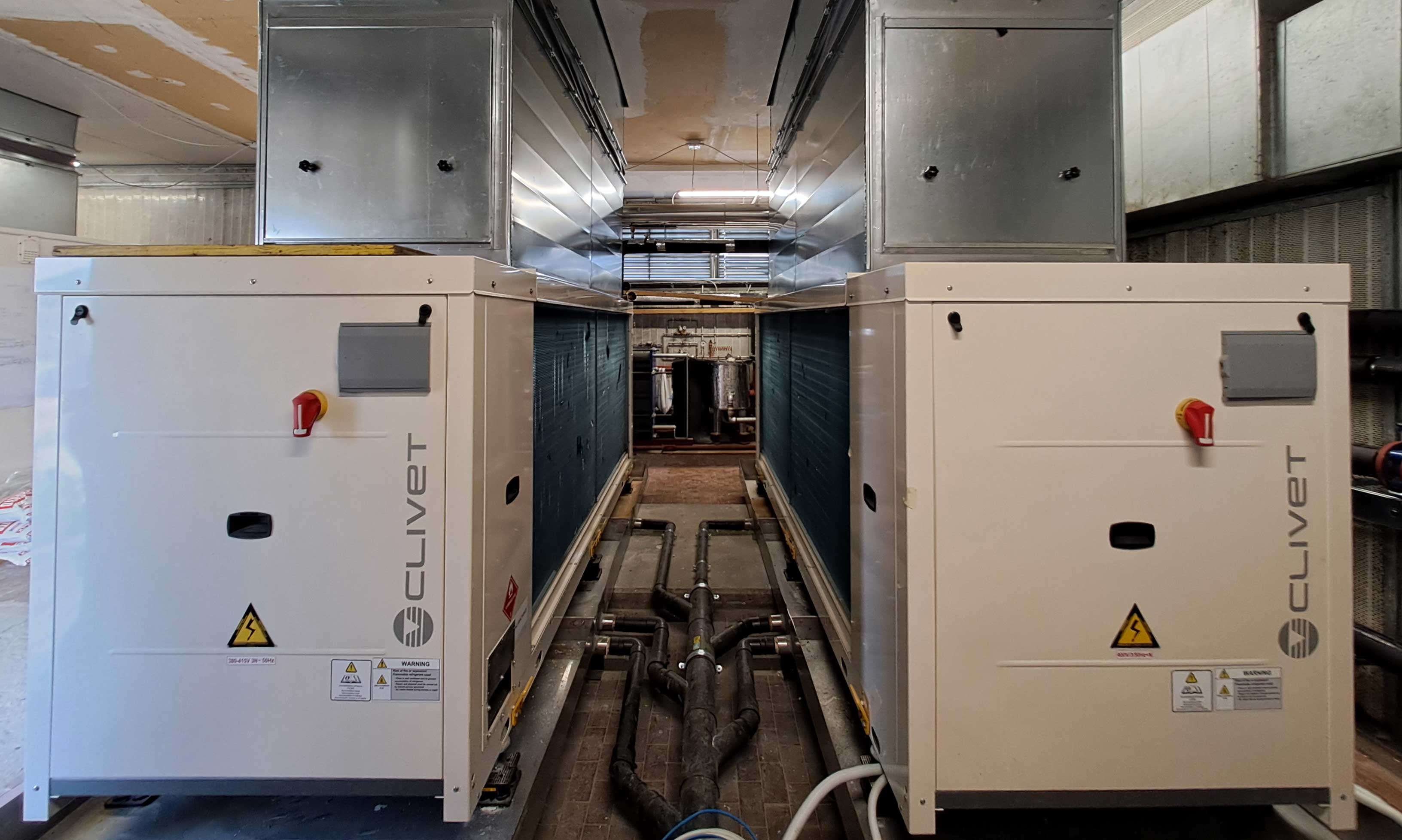 Le due caldaie sono state sostituite con 2 pompe di calore ad alta efficienza con tecnologia inverter e refrigerante ecologico R32 Sheen EVO 2.0 e 2 caldaie a condensazione da 200 kW, che vengono usate come back-up ed integrazione nei casi di richiesta di acqua ad alta temperatura. Le pompe di calore possono essere usate anche in back up al chiller nei picchi di richiesta di raffrescamento.